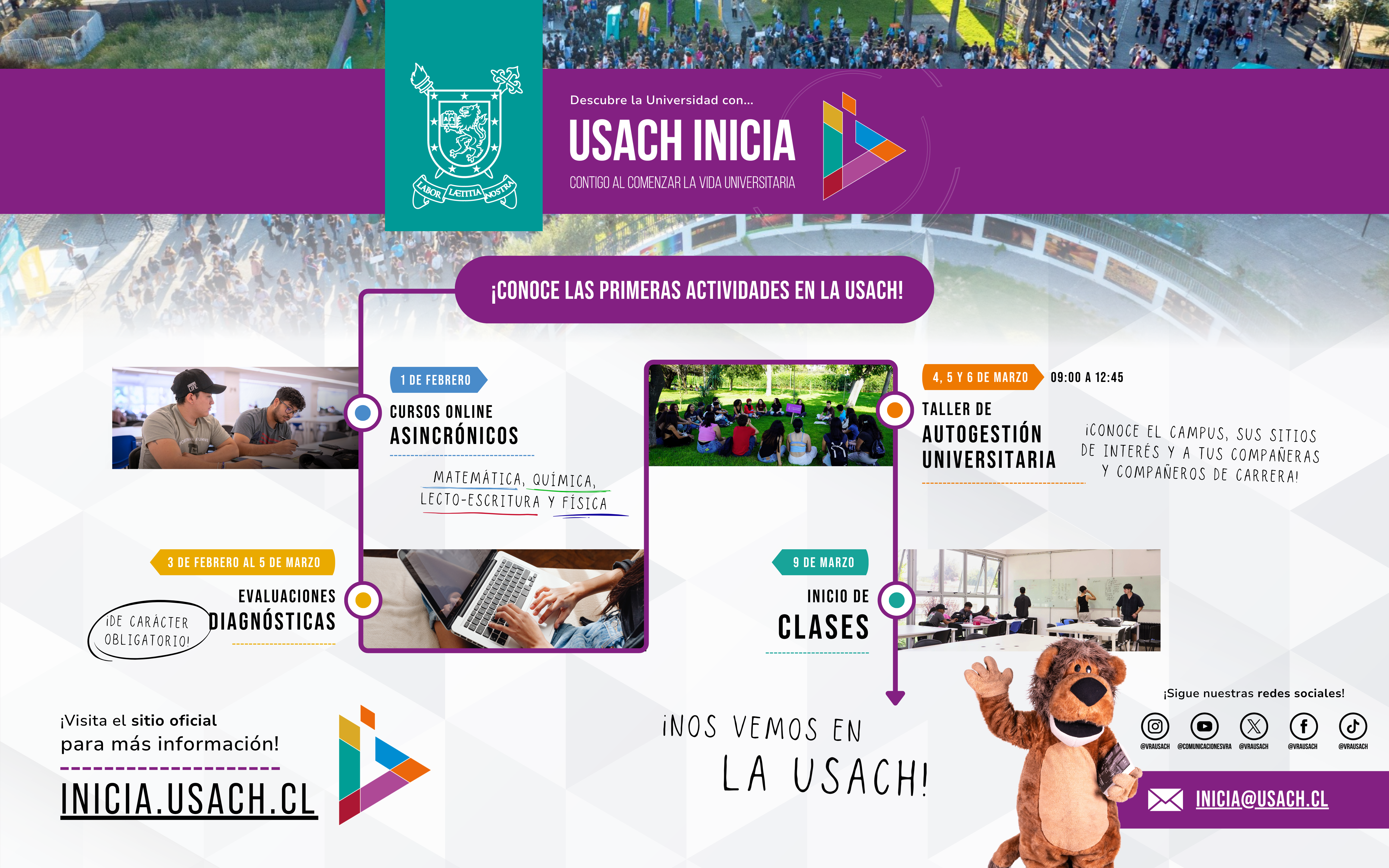 Usach Inicia te da la oportunidad de conocer el Campus Universitario y a tus nuevas y nuevos compañeros de carrera ¡Antes de ingresar a clases! en el Taller de Autogestión Universitaria.